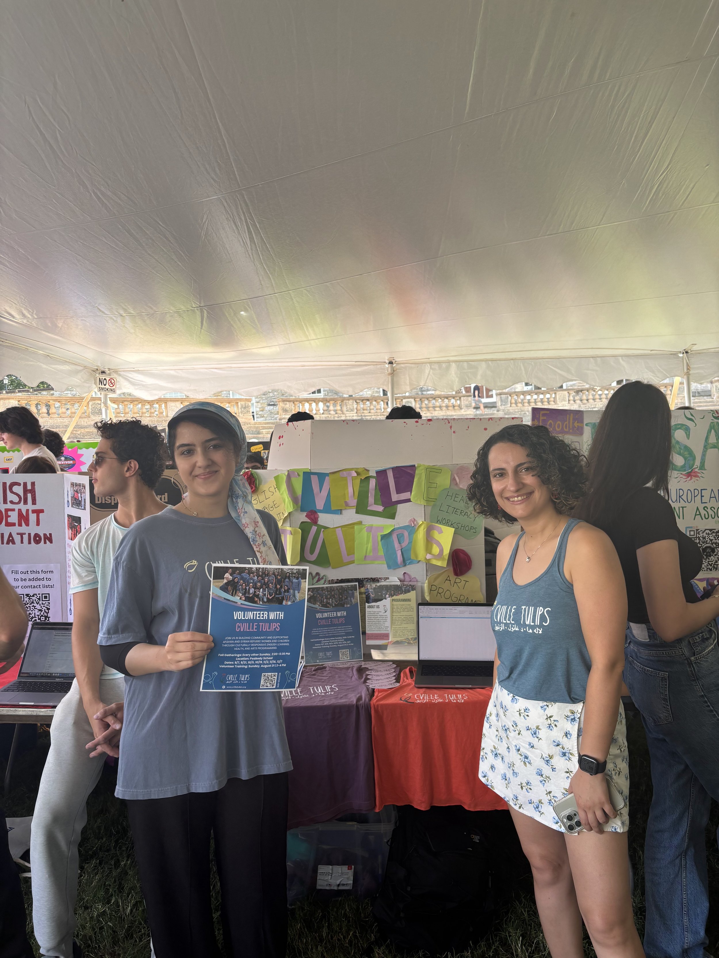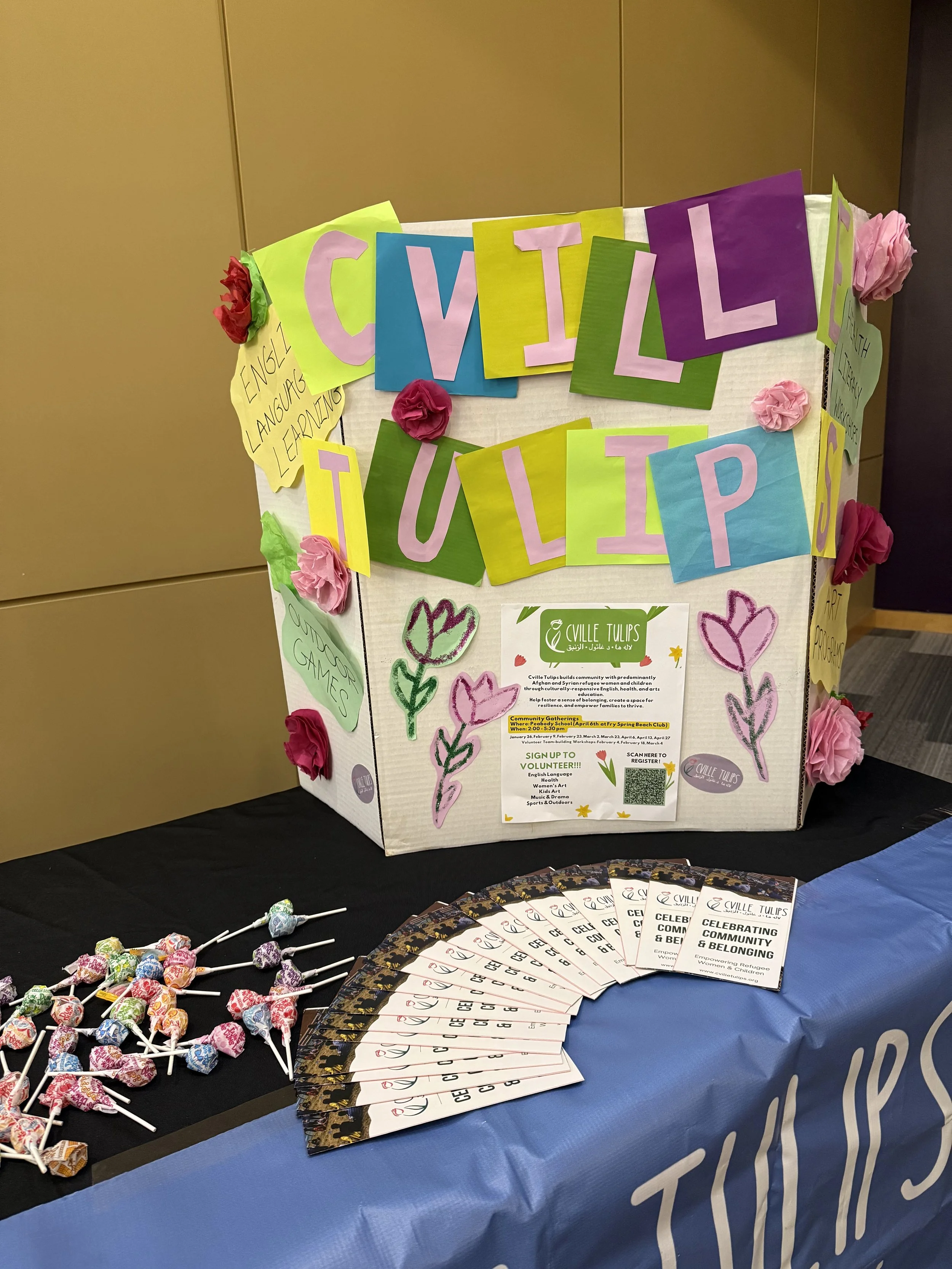 Cville Tulips is frequently invited to “table”: to participate in community events to share resources, connect with new families, recruit volunteers, and engage with community partners. “Tabling” also resembles a tradition that Afghan and Syrian families know well. The word dastarkhān in Dari refers to the act of laying out a cloth and sharing food and tea to bring people together.
